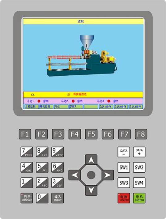 10.4"TFT 液晶顯示器,640×480點陣,中英文顯示; 鍵盤部分用參數輸入、加熱與電機的啟?刂疲 采用RS485接口與主機、PC機或其它工業產品(如變頻器、PLC等)通信,實現程序在線燒錄及相關動作控制; 參數曲線記憶功能,繪制10分鐘以內的溫度變化曲線。多組模具參數記憶功能; 15段的溫度采樣及控制,8段吹風控制; 溫度輸入接K型熱電偶,測溫范圍是0~400℃; 三路DA輸出0~10V電壓,控制電機轉速; 二路AD輸入,采樣0~10V電壓信號,用于壓力閉環控制; 繼電器輸出可接交流接觸器; 主機控制采用220V輸入開關電源, 輸出 +24V/1.5A,+12V/1A,–12V/1A; 顯示面板采用220V輸入開關電源, 輸出 +24V/1A; 上下位機均為高性能DSP微處理系統; 溫度主要采用PID控制方式,控制參數可調并存于密碼頁面中; 完善的報警功能:當前工況之溫度,電流,轉速不在預設范圍之內時,系統報警請求認為干預,當擠出機檢測缺料,牽引力不足等情況及系統故障時,也有相應報警輸出; 采用美國,臺灣進口優質元器件,系統故障率低,穩定性好。