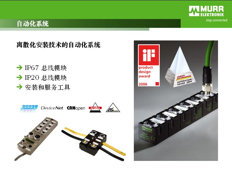 . MURR自主研發的CUBE67現場總線系統,將I/O移置工作現場 一個從站模塊可以擴展256個I/O點,且同一I/O模塊可以隨意轉換DI/DO . 支持PROFIBUS,DeviceNet,CANopen等一系列總線協議