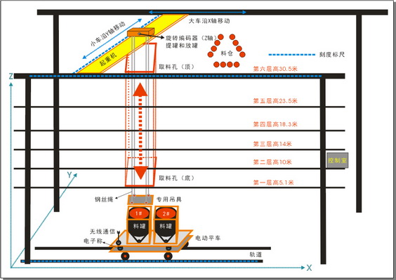 自動(dòng)控制核心點(diǎn): 1. 位置檢測(cè):電動(dòng)平車自身取料,起重機(jī)調(diào)運(yùn)重罐和回放空罐,起升高度檢測(cè); 2. 專用吊具:自動(dòng)掛鉤和摘鉤; 3. 防搖擺:料罐重載或空載時(shí)穿過(guò)六層樓板的5米方孔提升或回放32米,取料孔到料倉(cāng)運(yùn)行; 4. 料重檢測(cè):料罐重載和空載判斷,加料重量; 5. 軟件思想:工作循環(huán)13分鐘時(shí)間控制,自動(dòng)尋找需要卸料的料倉(cāng),防搖擺控制。