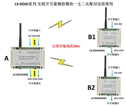 LX-RDIO系列無線開關量測控模塊目前配置有:2DI/2DO4DI/4DO8DI/8DO等三種配置產品;無線發射功率標準配制有100mW(視距600)1000mW(視距3000)等兩種規格,如需更遠距離,可另選無線配置。