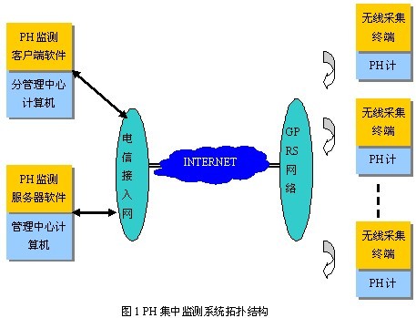 圖中的PH計放置在每個需要監(jiān)測的監(jiān)測點,每個PH計通過串口連接一個無線采集終端,采集終端通過GPRS無線上網(wǎng),將數(shù)據(jù)通過INTERNET互聯(lián)網(wǎng)傳輸?shù)焦芾碇行摹?/DIV>