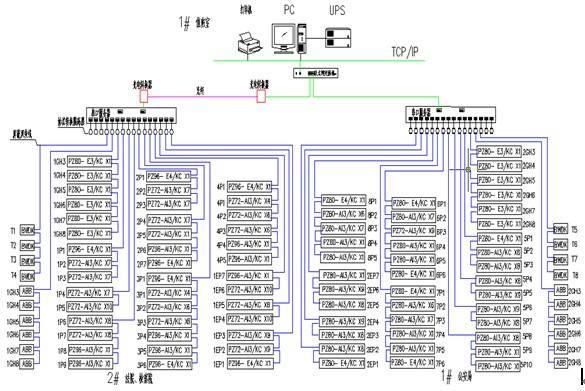 嘉定司法中心的值班室位于1#公安局負一層變配電室旁,配置一臺工業網絡交換機;2#變配電室現場采用13根總線,使用一臺16口的串口服務器,通過光纖連接至1#值班室內的交換機上;1#變配電室現場采用13根總線,使用一臺16口的串口服務器,連接至值班室內的交換機;再通過大樓的局域網把數據傳輸到后臺系統。