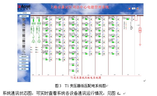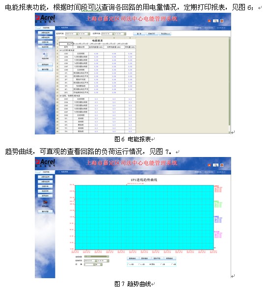 Acrel-3000電能管理系統具有通用性好、可靠性高、組態靈活等優點,在嘉定司法中心項目上得以成功應用。隨著計算機信息技術的普及,低壓配電智能化的要求也越來越高,變配電監控及低壓配電管理使得實現配電室的無人職守真正成為現實,系統對各種用電設備的歷史運行數據和狀態進行管理分析,便于維護人員明確設備狀況,制定詳細的設備維護計劃,減少人力投入,提高工作效率,從而降低整個系統的運營成本。