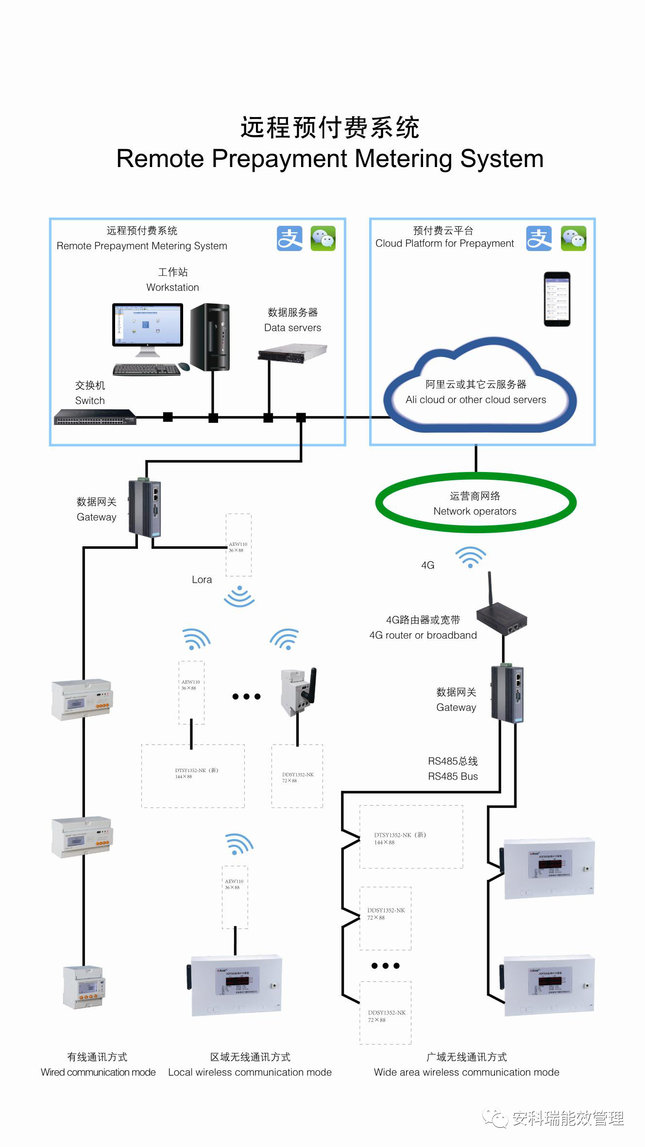 本項目設計的預付費云平臺,由安科瑞品牌三相預付費電能表DTSY1352-NK/單相預付費電能表DDSY1352-NK/多用戶預付費計量箱ADF300,數據網關、RS—485總線(局域網或LORA局域網)、公網、云服務器、系統管理網站及預付費APP組成。
