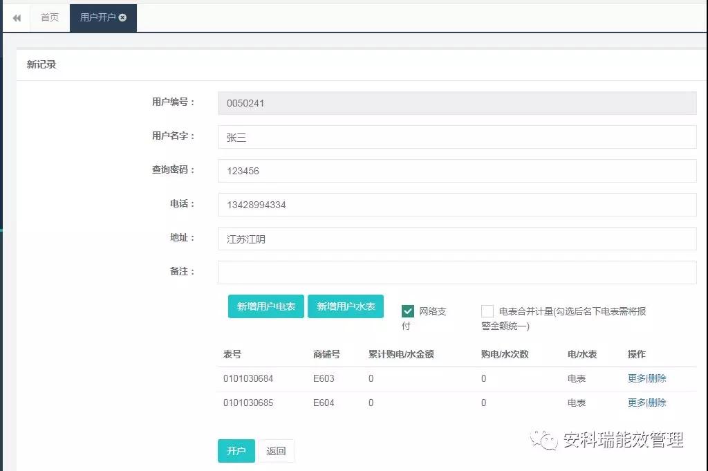 系統針對商鋪開戶不僅支持一戶一表,也支持一戶掛多表的需要;同時支持和解決了項目改造后新老表切換時,老表金額轉入的問題;支持峰谷電價,支持一表一電價;可對單表設置功率過載的閾值,也支持設置單表金額報警的兩級閾值。